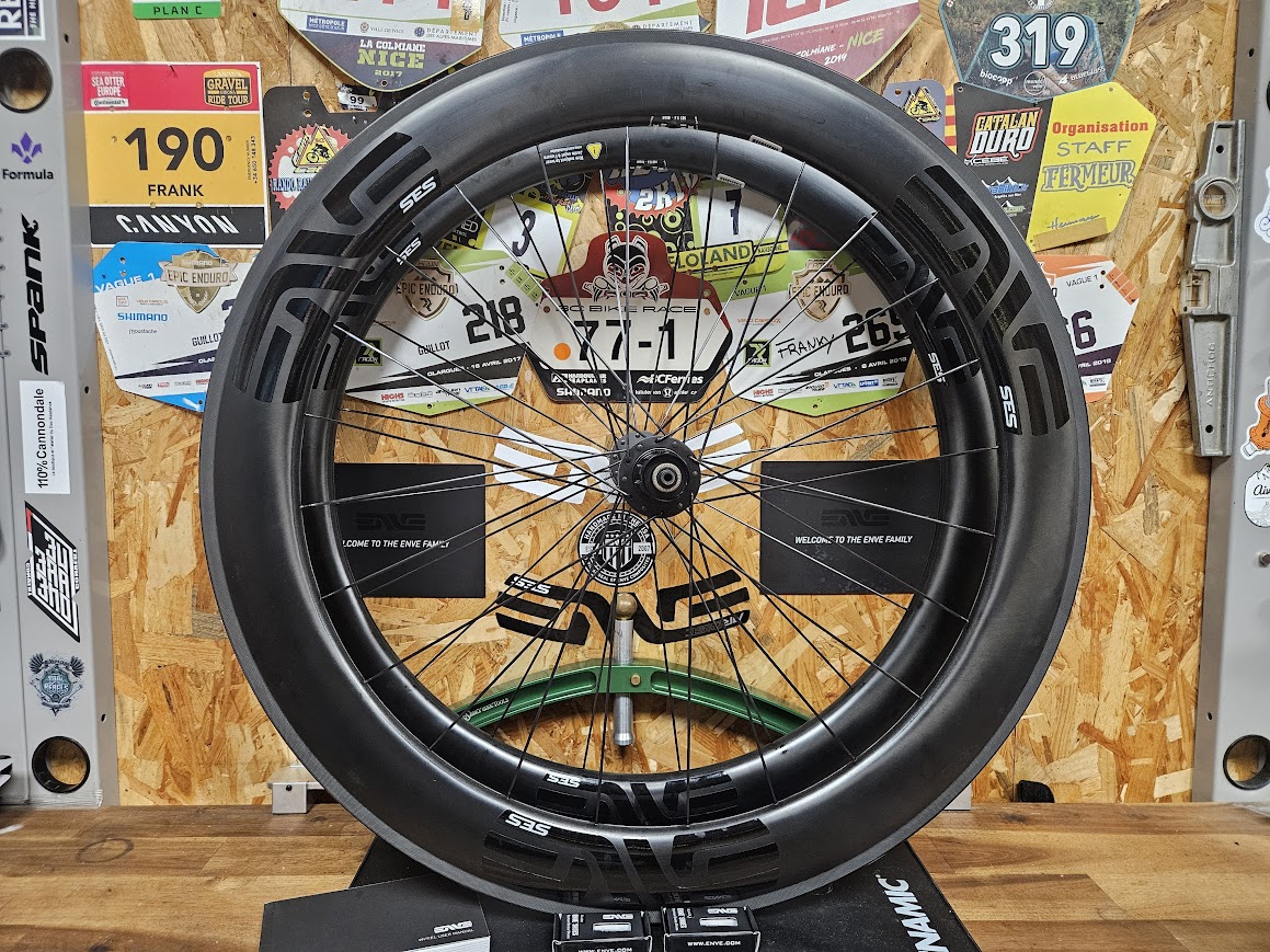 - Paire de roues patins ENVE 5.6 (54mm AV / 63mm AR)Montage artisanale sur base de moyeux DT Swiss 240 EXP (20H AV / 24H AR)poids : 1585g